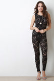 This jumpsuit features a soft knit fabrication, distressed and hole pattern throughout, boat neckline, and sleeveless fit. Finished with taper cut legs. Accessories sold separately. Made in U.S.A. 85% Polyester, 15% Spandex.