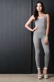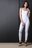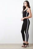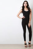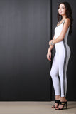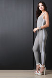 This jumpsuit features a jersey knit fabrication, contrasting stripes on side, sleeveless fit, and open back construction. Finished with taper cut legs. Accessories sold separately. Made in U.S.A. 95% Cotton, 5% Spandex.
