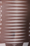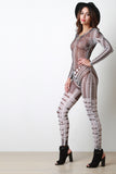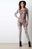 This jumpsuit features semi-sheer mesh, geo print, round neckline, long sleeves, and back cutout with single button closure. Accessories sold separately. Made in U.S.A. 95% Polyester, 5% Spandex.