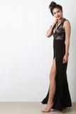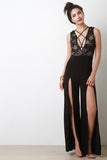 This jumpsuit features a floral lace top, plunging v-neckline with crisscrossing strappy lace up design, open back, contrasting solid bottom, and wide leg pants with front high slits. Accessories sold separately. Made in U.S.A. 96% Polyester, 4% Spandex.