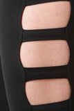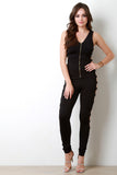 This jumpsuit features a smooth stretchy knit fabrication, v-neckline with gold zip-up front closure, and side cutouts. Finished with tapered cut legs. Accessories sold separately. 93% Polyester, 7% Spandex.