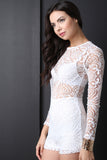 This romper features a semi-sheer mesh fabrication with burn-out pattern, shorts underlay, round neckline, and long sleeves fit. Finished with an exposed rear zip-up closure. Accessories sold separately. Made in U.S.A. 100% Polyester.