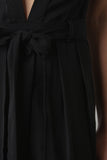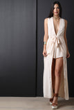 This romper features plunge neckline, self-tie belt, maxi length wrap, partially hidden shorts, and back zipper closure. Accessories sold separately. 94% Polyester, 6% Nylon.