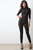 This cutting edge jumpsuit features stretch knit, laser cut perforations, mock neck, long sleeves, and back zipper closure. Accessories sold separately. Made in USA. 86% Polyester. 14% Spandex.