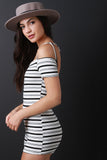 This romper features soft rib knit, striped design, self-tie spaghetti straps, open shoulders, short sleeves, and open back. Accessories sold separately. Made in USA. 95% Rayon, 5% Spandex.