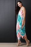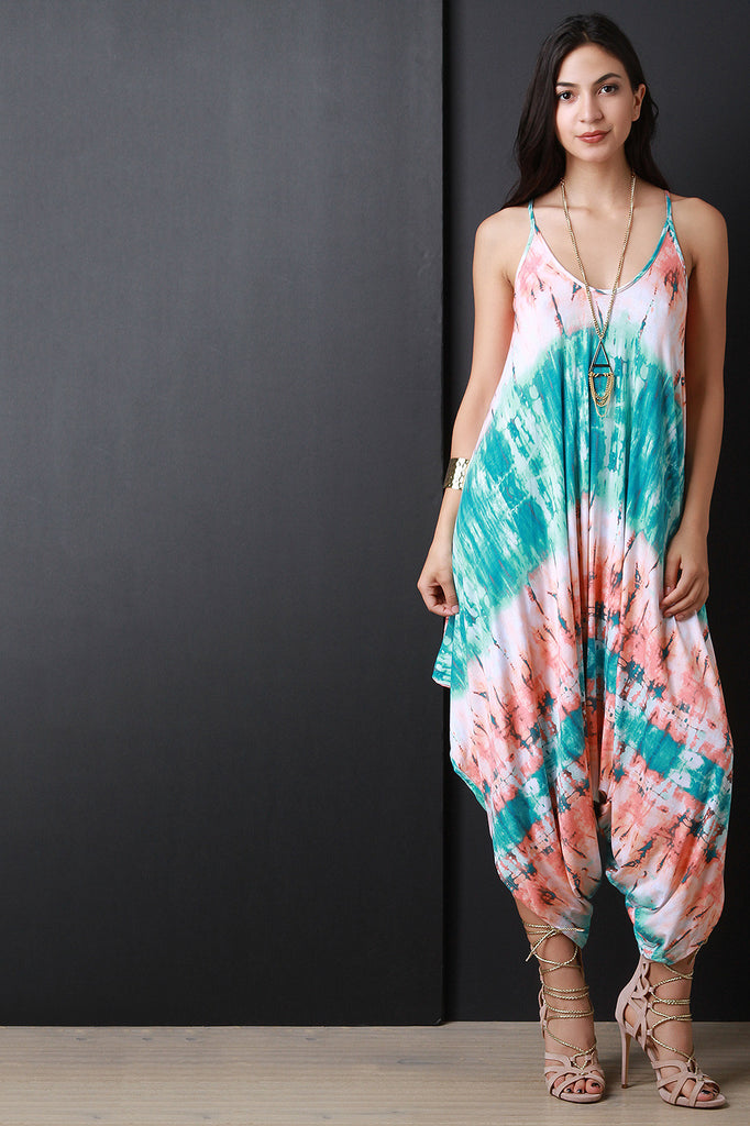 This jumpsuit features tie dye jersey knit, scoop neckline, spaghetti straps, and harem style design. Accessories sold separately. 94% Rayon, 6% Spandex.