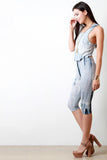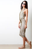 This casual jumpsuit features a jersey knit fabrication, tie dye print design, scoop neckline, and crisscross back detail. Finished with a cinched elasticized waist and knee-length hemline. Accessories sold separately. Made in U.S.A. 96% Rayon, 4% Spandex.