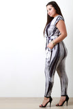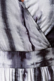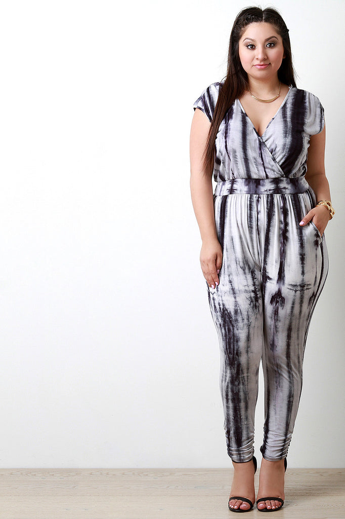 This romper features a jersey knit fabrication with tie dye print, surplice v-neckline, and cap sleeve construction. Finished with a wide elasticized waist band, and taper cut cinched side hemline. Accessories sold separately. Made in U.S.A. 97 % Rayon, 3% Spandex.