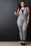 This jumpsuit features an attached hoodie back, sleeveless construction, elasticized cinched waist, and taper cut leggings. Finished with a deep v-neckline crisscrossing strap lace-up detail. Accessories sold separately. Made in U.S.A. 49% Rayon 47% Polyester 4% Spandex.