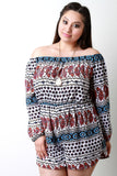 This romper features a woven knit fabrication, boho paisley print, elasticized off the shoulder neckline, and long sleeves with cuffed ends. Finished with an elasticized high waist design. Accessories sold separately. Made in U.S.A. 100% Polyester.