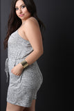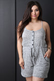 This plus size romper features a soft marled knit fabrication, scooped neckline with fixed spaghetti shoulder straps, button-up front, and elasticized waistline with tie center. Finished with a side slanted pockets and half bottom shorts. Accessories sold separately. Made in U.S.A. 49% Rayon, 47% Polyester, 4% Spandex.