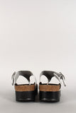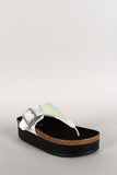 Featuring textured iridescent leatherette upper, T-strap thong construction with adjustable buckle, open toe, flat platform heel, molded insole, and an easy slip on style.