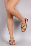 This charming flat sandal features a thong construction with jewel center hardware accent, multicolor beads with chain embellished instep straps, v-strap design, and low stacked heel. Finished with lightly padded insole and adjustable slingback strap with buckle closure.