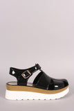 This sandal features a PVC upper, cage design at front, round toe, and two-tone flatform heel. Finished with an adjustable ankle strap with side buckle fastening.