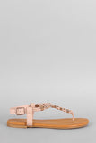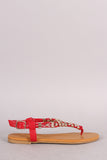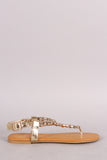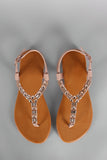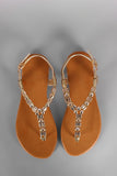 This pretty thong flat sandal features a t-strap construction with metal beads ornament embellishment, lightly padded insole, and adjustable ankle strap with buckle fastening.