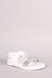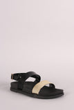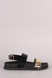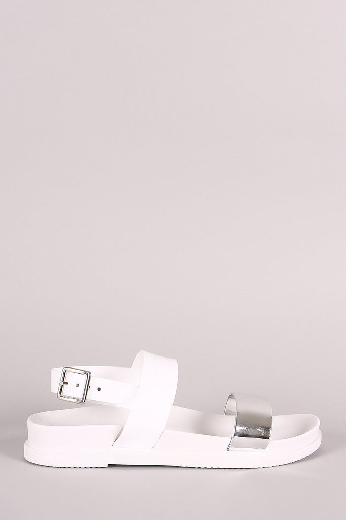 This cute flat sandal features two jelly PVC upper bands, one band with metallic finish, open toe silhouette, and slingback strap with adjustable buckle closure. Finished with cushioned insole.