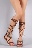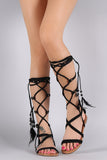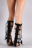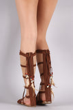 This breezy summer sandal features a strappy construction with studs detail, braided lace-up design with beaded feather accent, lightly padded insole, and back-zip closure.