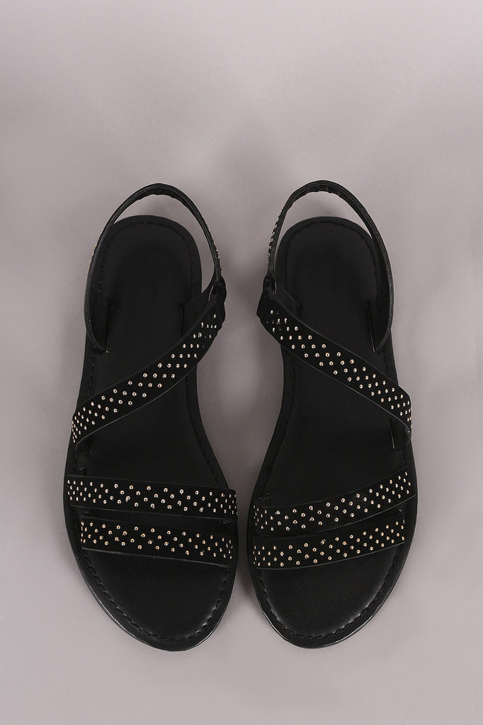 This casual-chic sandal features an asymmetrical straps adorned with polished dome studs, open toe silhouette, lightly padded insole, and easy slip-on construction.