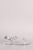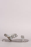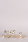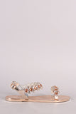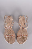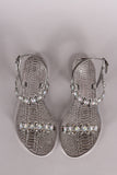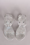 This glossy flat sandal features an open toe silhouette, instep straps with sparkling jewels accent, snake embossed design, and adjustable ankle strap with buckle closure.
