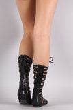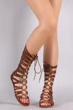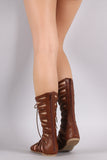 This gladiator flat sandal features a strappy construction with adjustable lace-up design, open toe silhouette, lightly padded insole, and rear zipper closure for easy on/off.