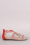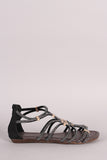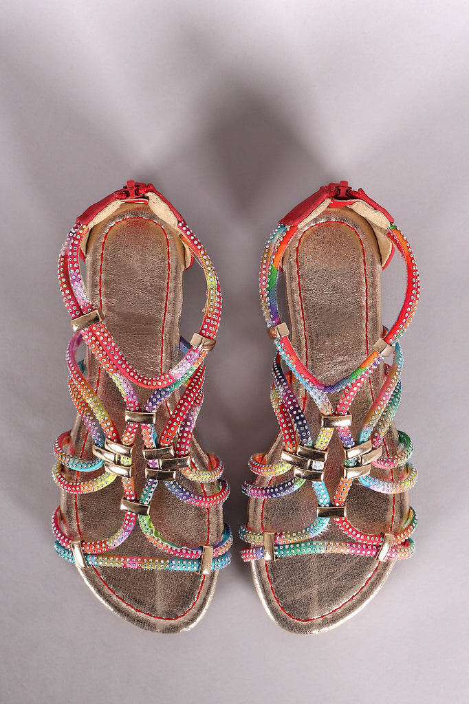 This open toe flat sandal features a strappy design with allover rhinestone embellishment and metal hardware accents. Finished with slight stacked heel, lightly padded insole, and convenient back-zip closure.