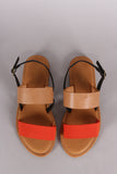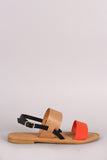 This flat sandal features two tone color, double band across vamp, open toe silhouette, and slingback with adjustable buckle closure. Finished with a lightly padded insole.