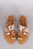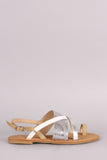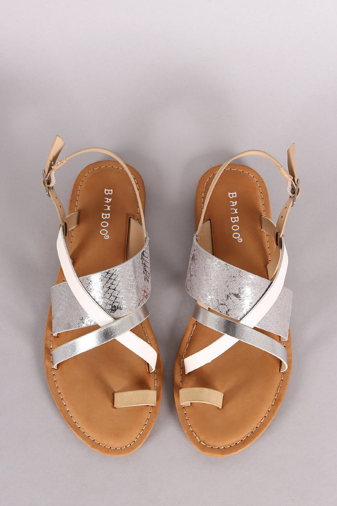 This flat sandal features a two tone asymmetrical metallic straps, snake texture design, slingback construction, and soft toe ring. Finished with a lightly cushioned insole and side buckle closure.