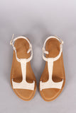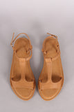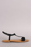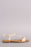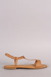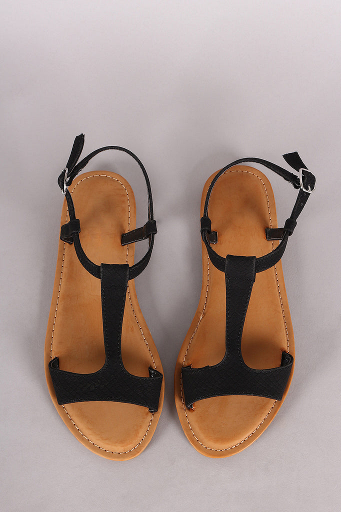 This open toe flat sandal features a snake embossed vegan leather upper, T-strap construction, lightly padded insole, and adjustable ankle strap with buckle fastening.