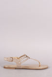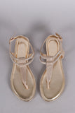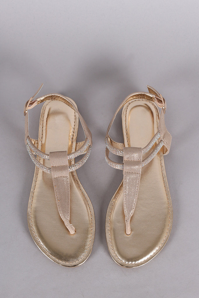 This stylish thong flat sandal features a T-strap construction, iridescent glitter fabrication, rhinestone strap embellishments, lightly padded insole, and adjustable ankle strap with side buckle fastening.