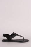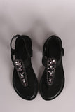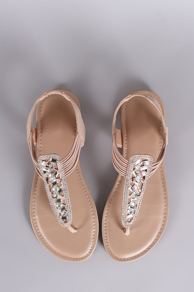 This dazzling flat sandal features a cutout T-strap design with sparkling rhinestones accent, instep elasticized straps, lightly padded insole, and easy slip-on construction.