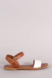 This flat sandal has a single band across the vamp, featuring an adjustable ankle strap.