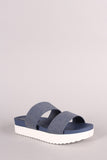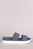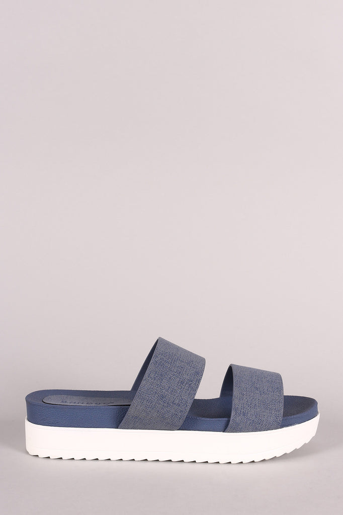 This denim print nubuck upper, open toe silhouette, double wide bands across vamp, and lightly cushioned insole for comfort.