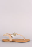 This edgy flat sandal features a T-strap construction with metallic cut out cuff detail. Finished with a lightly padded insole, and adjustable slingback strap with buckle fastening.