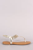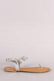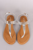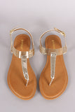 This edgy metallic flat sandal features a T-strap construction with metallic cut out cuff detail. Finished with a lightly padded insole, and adjustable slingback strap with buckle fastening.