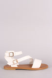 This flat sandal features an open toe silhouette, asymmetrical straps design, lightly padded insole, and adjustable ankle strap with buckle fastening.