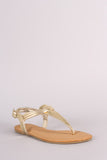 This flat sandal features a T-strap construction, triple instep straps design, lightly padded insole, and adjustable side buckle closure.