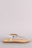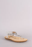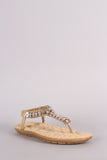 This shimmery flat sandal features a t-strap design with sparkling rhinestone accents, elasticized slingback strap, and cushioned insole for comfort.