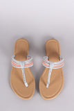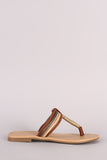 This flat sandal features an assorted instep straps, T-Strap with spiral hardware accent, and lightly padded insole.