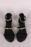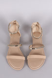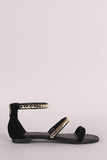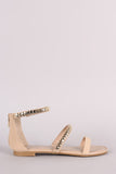 This fabulous sandal features an open toe silhouette, triple skinny straps, metallic hardware accents, lightly padded insole, and rear zipper closure for easy on/off.