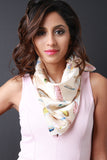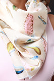 This adorable scarf features smooth fabric, feather print throughout, and self-tie design.
