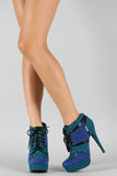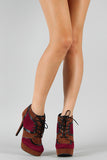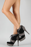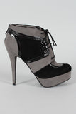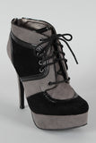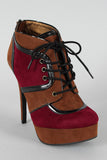 Lift up your ensemble with these two tone platform booties! Featuring smooth faux suede upper with leather piping details, round toe, lace up front closure, covered tribute platform, and stiletto heel. Finished with cushioned insole and rear zipper closure for easy on/off.