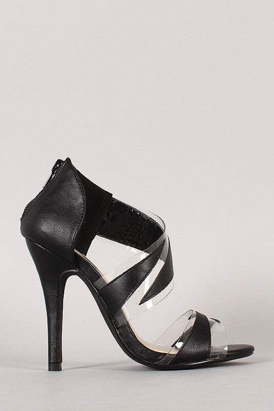 Get a lovely look with this stunning heel ! Featuring open toe, leatherette upper with clear lucite trim, stitching detail, and stiletto heel. Finished with lightly padded insole and rear zipper closure for easy on/off.