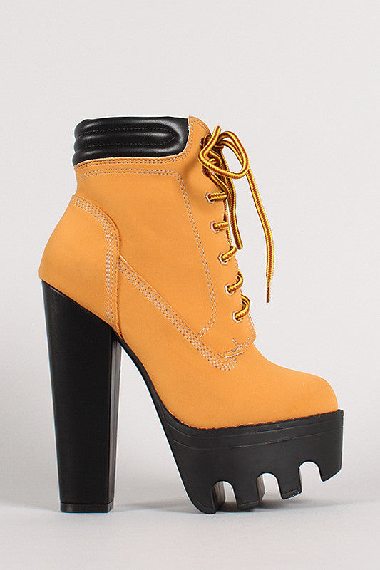 Featuring smooth nubuck upper, round toe, lug sole platform, lace up front, padded collar, chunky heel, stitching detail, and finished with cushioned insole for comfort.
