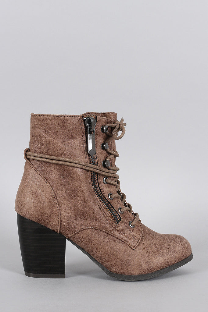 This ankle  bootie  features a round toe silhouette, oil-finish faux suede upper with lace up design, and chunky stacked heel. Finished with cushioned insole and side zipper closure for easy on/off.