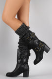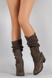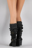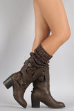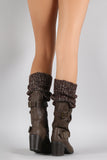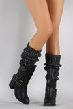 These warm knee high boots feature a round toe silhouette, decorative buckle strap detail, knit sweater on upper shaft, and chunky stacked heel. Finished with cushioned insole and easy pull-on construction.