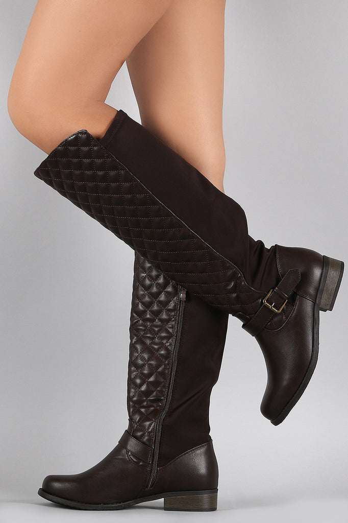 These knee high boots features a round toe silhouette, combination of quilted vegan leather with stretchy Lycra fabric upper, decorative buckle strap detail, asymmetrical collar design, and low heel. Finished with cushioned insole, smooth lining, and partial side zipper closure for easy on/off.