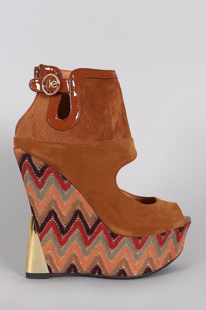 This gorgeous peep toe wedge features a perforated cuff with patent trim, decorative buckle accents, woven multicolor glitter fabric covered platform, and metallic accent wedge heel. Finished with cushioned insole and rear zipper closure for easy on/off.