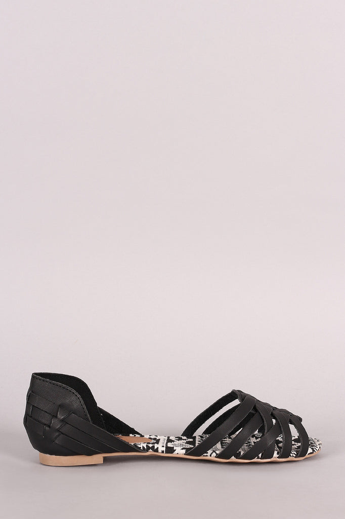 This dorsay style flat features vegan leather, open toe, strappy woven design, low flat heel, and lightly padded insole.