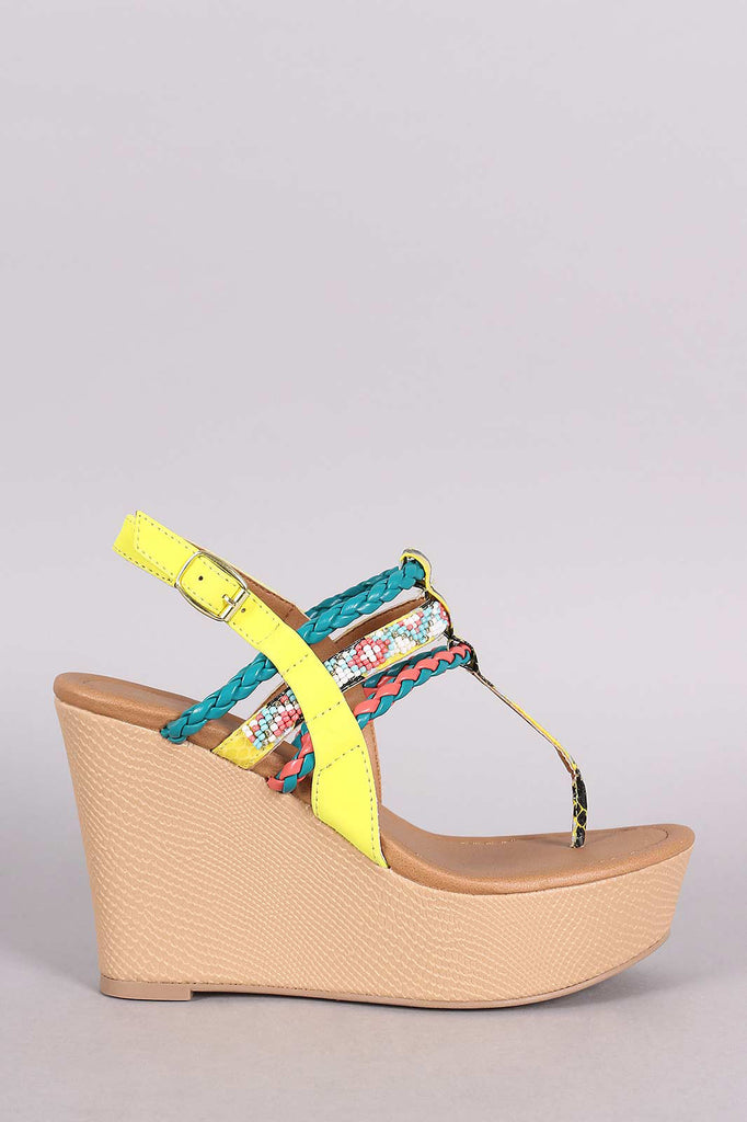 This beautiful slingback wedge features a python print t-strap construction, triple braided instep straps with beaded Aztec design on center strap, lightly padded insole, and snake embossed embossed platform wedge heel.