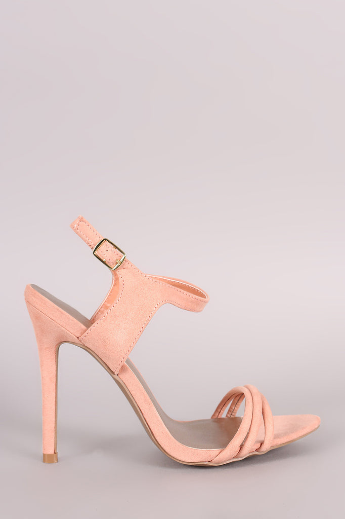 This stunning  heel  features an open toe silhouette, triple straps across vamp, wrapped stiletto heel, lightly padded insole, and adjustable ankle strap with buckle fastening.